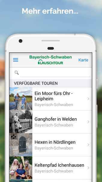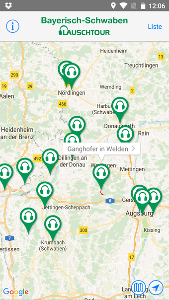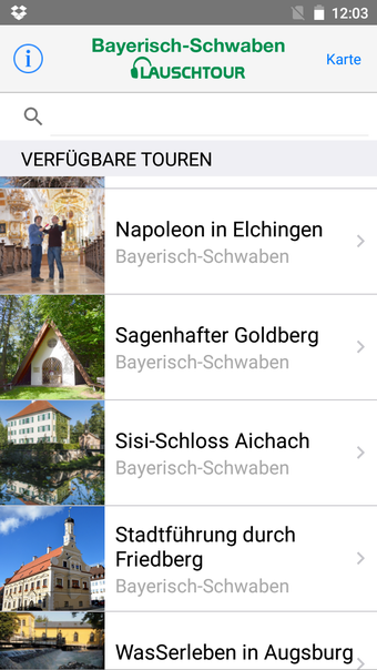 バイエルン・シュヴァーベン・ラウシュツアーは、LAUSCHTOURによって開発された無料のGPSオーディオガイドアプリで、Androidデバイスで利用できます。このアプリは、アウクスブルク、エルヒンゲン、ロッゲンブルクなど、地域で最も美しい都市や自然スポットを探索するための21の個別のオーディオガイドを提供しています。このアプリはオフラインで動作するため、ツアーを開始する前にオーディオファイルをダウンロードしておくことができ、インターネット接続は必要ありません。